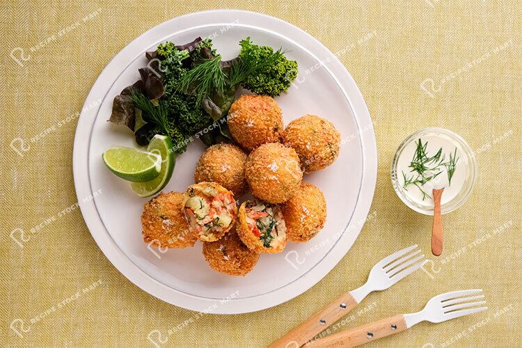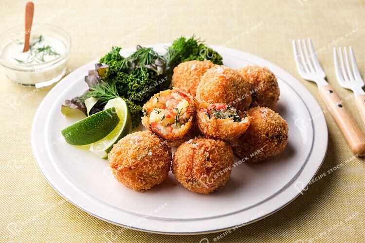 なめらかなじゃがいもに粉チーズでコクをプラス。カリッと揚げた衣の香ばしさが魅力で、添えたディル入りヨーグルトソースが絶妙な味わいを演出します。