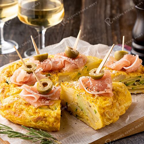 ズッキーニ、じゃがいも、玉ねぎをふんだんに使ったスペイン風オムレツ「トルティージャ」です。オリーブオイルとにんにくの香りが食欲をそそり、粉チーズや卵がコクをプラス。仕上げに生ハムやグリーンオリーブを添えることで華やかな一品に。
